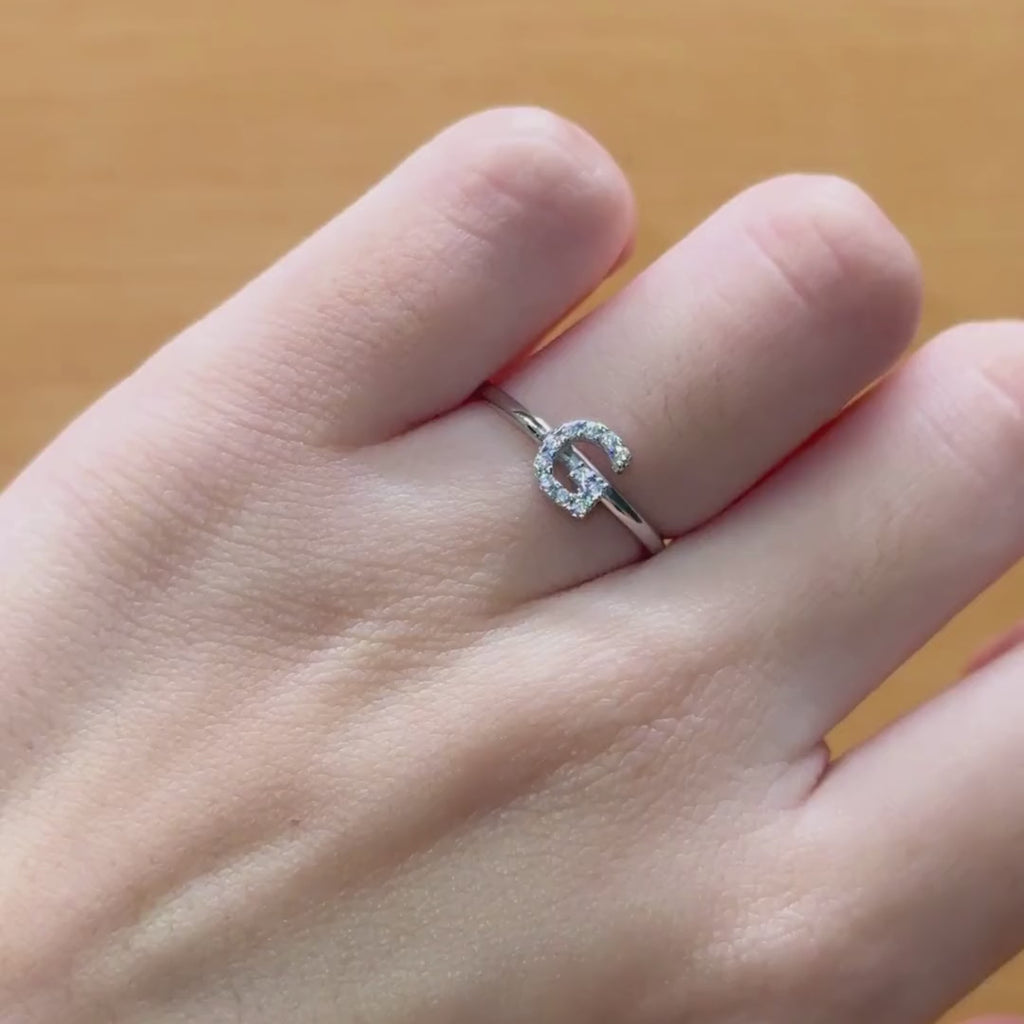 18-karat white gold ring with letter G and brilliant-cut zirconia in the center.