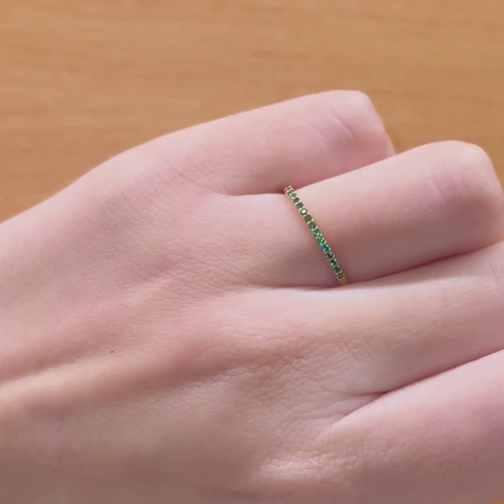 Anillo de oro amarillo de 18 kilates carril con quince esmeraldas naturales en talla brillante engastadas en cuatro garras.