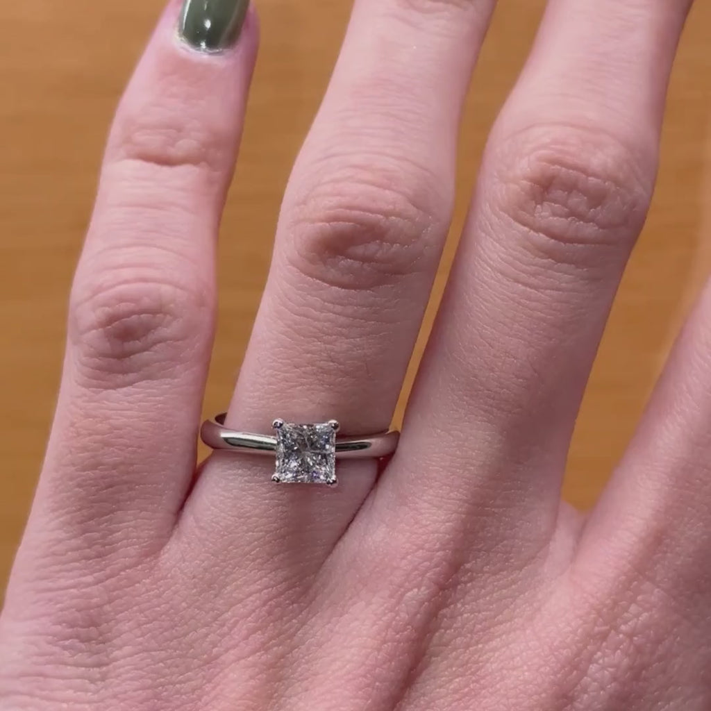 Anel solitário de ouro branco de 18 quilates com um diamante criado em laboratório certificado pelo I.G.I em corte princesa de 1,030 quilates no total, engastado em quatro garras. Com este anel acompanha um certificado I.G.I que comprova a pureza, cor, corte e peso dos diamantes.
